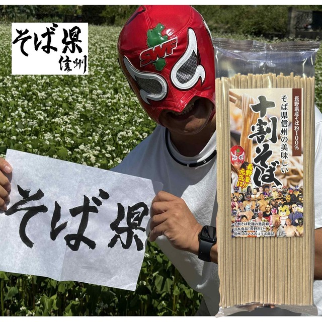 【新発売】信州プロレス十割そば 100%信州産!! 信州プロレスオリジナルの十割そばが新登場しました! このそばは、そんじょそこらの乾麺ではありません!全国メディアでも「美味しい十割乾麺日本一」として紹介される長野市の山本食品によって丁寧に作られています。 香り高く、コシの強い十割そばは、信州の麺文化を体現した逸品!乾麺での十割そばは非常に珍しく、本格的なそばを楽しむことができます。 もちろん100%長野県産のそば粉を使用!なのでそば湯もしっかり飲めます!! 数量限定となっておりますので、信州の美味しいそばをお楽しみたい方、そば通の方には特におすすめです!この貴重な機会をお見逃しなく! お土産にいかがでしょうか??ここでしか買えません!! そば県信州の美味しいお蕎麦をぜひ!
